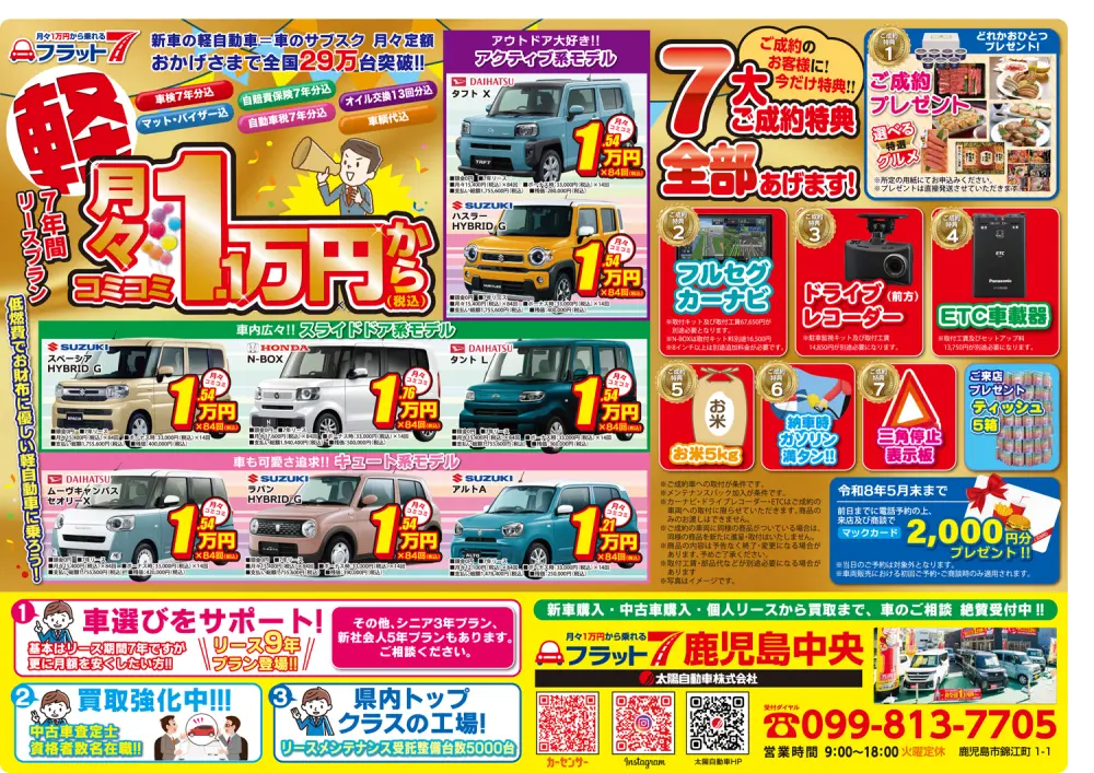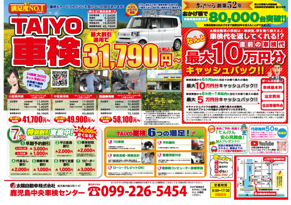 ※1ヶ月以内に鹿児島市内で発行されたもので、車検に必要な法定24ヶ月点検、完成検査料、登録申請手数料などの「車検料」が対象です。ユーザー車検代行などの分解整備を伴わないものは除きます。