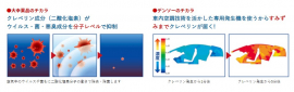 車室内に濃度を最適化した二酸化塩素を発生させ、最適な風量・風向で、車室内全体に効率的にクレベリン成分(二酸化塩素)が拡散し、洗浄が困難なシートや車室内の除菌・消臭を行うものです。