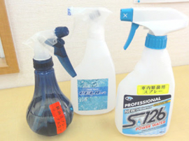 また、お客様のお車出庫時には「自動車用アルカリイオン洗浄水」を使い、ハンドル、シフトレバー、パワーウインドスイッチの除菌を行っております。